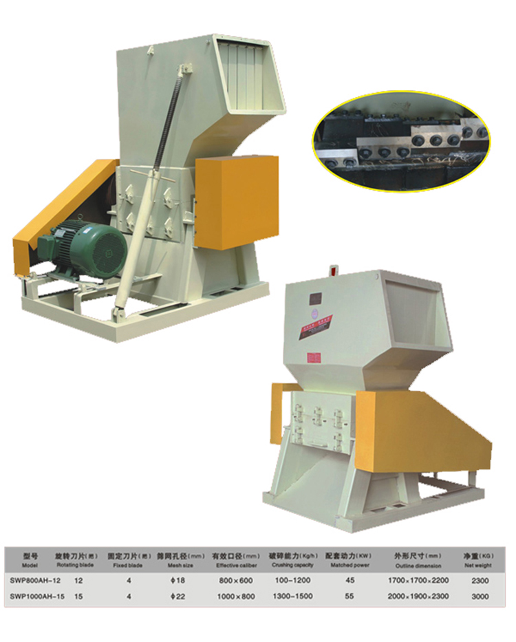 SWP 800AH-12、1000AH-15 crusheru is mainly suitable fore plastic,foam and other large blocks material. using ladder-type spindle.high toughness blade.reoeated cutting.so that the form of products be small to curush,reducing the loading while crushing.